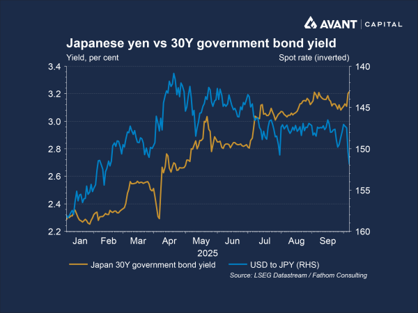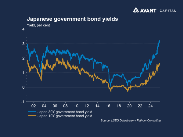 This steepening of the yield curve reflects investor concerns about Japan’s enormous debt burden, that currently sits at over 200% of GDP. Japan’s new Prime Minister, Sanae Takaichi, has also promised several new spending initiatives that may add to this debt pile, causing investors to demand greater yield compensation for holding long-dated JGBs, as they assign them a higher risk premium1.