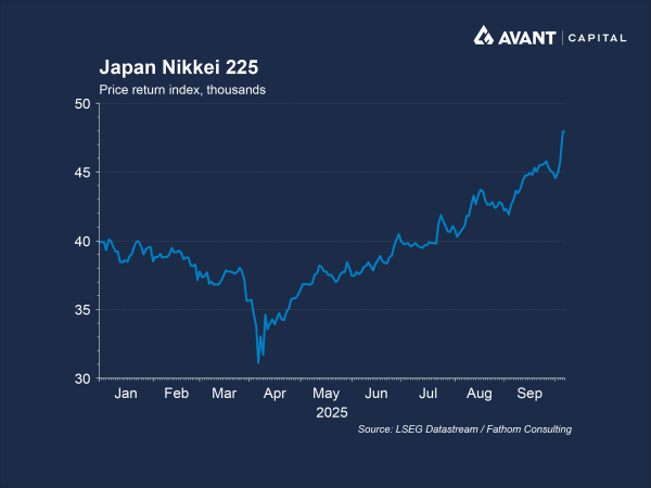 Despite the FX headwind for its exporting conglomerates, though, Japan’s equity market has still reached record highs4. Although demographic challenges are intensifying, with the number of births in 2024 falling below 700,000 for the first time since records began at the end of the 19th century5, Japan’s economy still grew 2.2% in Q2 20256. This marks the fifth consecutive quarter of expansion.