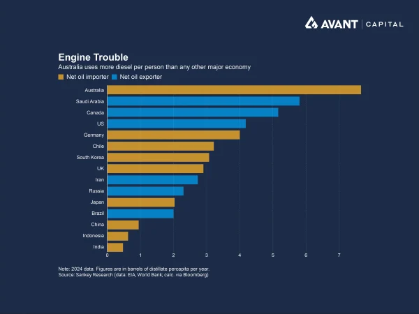 Australia’s exposure has been acute despite importing relatively little fuel directly from the Middle East. Petrol imports account for around 66% of demand, while diesel imports cover about 89% of domestic demand, and jet fuel imports account for roughly 80%5. Australia is due to receive its last pre-war cargo from the Middle East in mid-April, prompting the release of fuel reserves, tax cuts and the rollout of a national fuel security plan. Even so, analysts warn that structural shortages are likely if the conflict drags on.