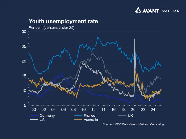 In the US, unemployment among those under 25 rose to 10.5% in August 2025, its highest since the pandemic and above the broader August 2025 unemployment rate of 4.3%.