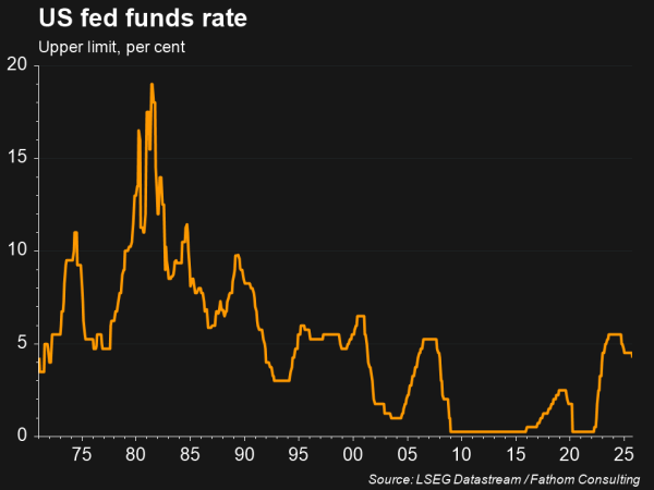 While the committee’s median expectation was for two additional rate cuts by year-end, this was pulled down by an outlier, Stephen Miran, Trump’s new appointment to the Fed, who advocated for 1.25% of cuts. Miran was also the only dissenting vote at September’s meeting, arguing for a 0.5% cut while the rest of the committee favoured 0.25%. Trump’s shadow therefore loomed large over September’s meeting through both Miran, his attempts to remove Governor Lisa Cook, and ongoing criticisms of Chair Powell, highlighting how the path for rate cuts, and Fed independence, remain highly uncertain.