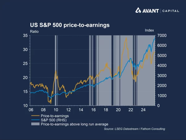 Several factors explain this caution. After months of rallying, investors are wary of stretched valuations, particularly in the technology sector. The S&P 500’s price-to-earnings (P/E) ratio has been well above its long-run average throughout 2025, highlighting that investors had already priced in significant profit growth ahead of third-quarter results. While some argue that the AI-driven growth potential supports higher multiples, others point to concentration risks, with the Magnificent Seven now accounting for 38% of the S&P 500’s market capitalisation and their performance critical for broader market returns9.