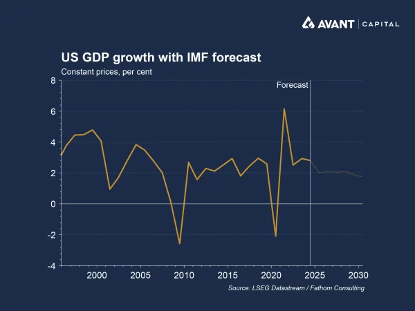 Growth has held up surprisingly well. The IMF forecasts US GDP growth of 2% in 2025, in line with the latest second-quarter figure of 2%, and expects it to remain broadly flat in 2026 as tariff effects are offset by continued AI-related capital expenditure, which reached nearly US$400 billion from Amazon, Google, Meta, and Microsoft alone in 20255.