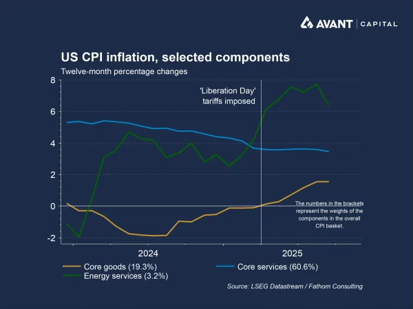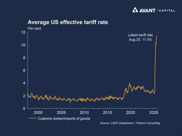 Following US President Donald Trump’s tariff announcements throughout 2025, the effective US tariff rate has risen from roughly 2.5% at the start of the year to around 11.5% by August. Trade agreements with the EU, UK, Japan, and others have helped to limit the extent of this increase, however tariffs remain well above historical norms. Levies on specific goods are particularly steep, such as 25% tariffs on autos and car parts, and up to 50% on steel1. Agricultural products such as coffee and bananas were exempted later in the year to ease grocery price pressures; however, even with these carve-outs, the US tariff regime remains the most protectionist in nearly a century2.