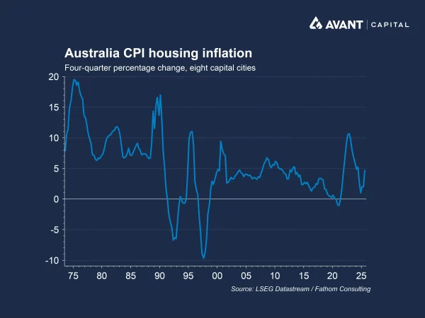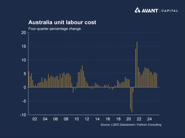 Beyond energy, services inflation proved particularly sticky. Prices for travel, dining out, and hospital care rose sharply, reflecting both strong demand and rising labour costs. The RBA has highlighted unit labour cost growth, running at around 5% annually, as a key driver of inflation in labour-intensive sectors5.