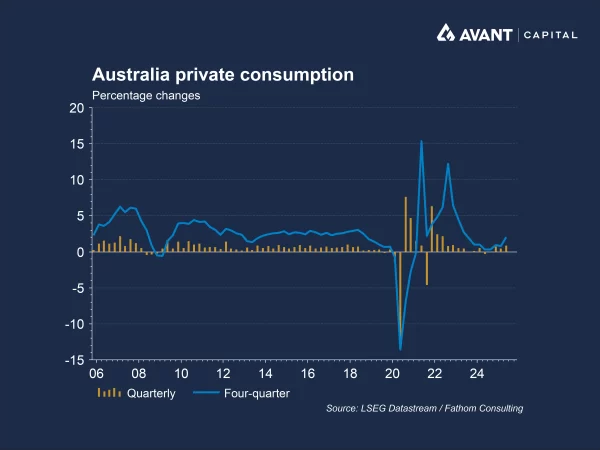 The RBA’s three rate cuts earlier this year helped fuel a rebound in consumer spending. However, with rates now on hold and inflation eroding real wages, households may begin to feel the pinch. The RBA expects real wages to go backwards in 2026 before recovering in 2027. Higher mortgage repayments and cost-of-living pressures could also dampen discretionary spending, particularly if inflation remains sticky and interest rates stay elevated.