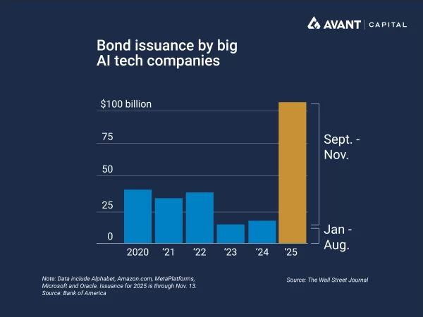 The artificial intelligence (AI) boom has triggered one of the largest borrowing sprees in corporate history. US tech giants, Amazon, Alphabet, Meta, Microsoft, and Oracle, alongside AI-focused firms like CoreWeave and xAI, are issuing unprecedented volumes of debt to bankroll colossal data centre projects. Since September, Amazon, Alphabet, Meta, and Oracle have sold nearly $US90 billion in investment-grade bonds, more than they issued in the previous 40 months combined1. Meta alone raised $US30 billion in October, while Oracle tapped markets for $US18 billion in September2.