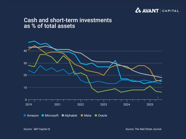 Big Tech entered the AI era with enviable balance sheets. According to JPMorgan, the hyperscalers collectively hold about $US350 billion in liquid assets and are expected to generate $US725 billion in operating cash flow in 20266. Yet, the projected $US5 trillion global AI infrastructure bill dwarfs even these resources7.